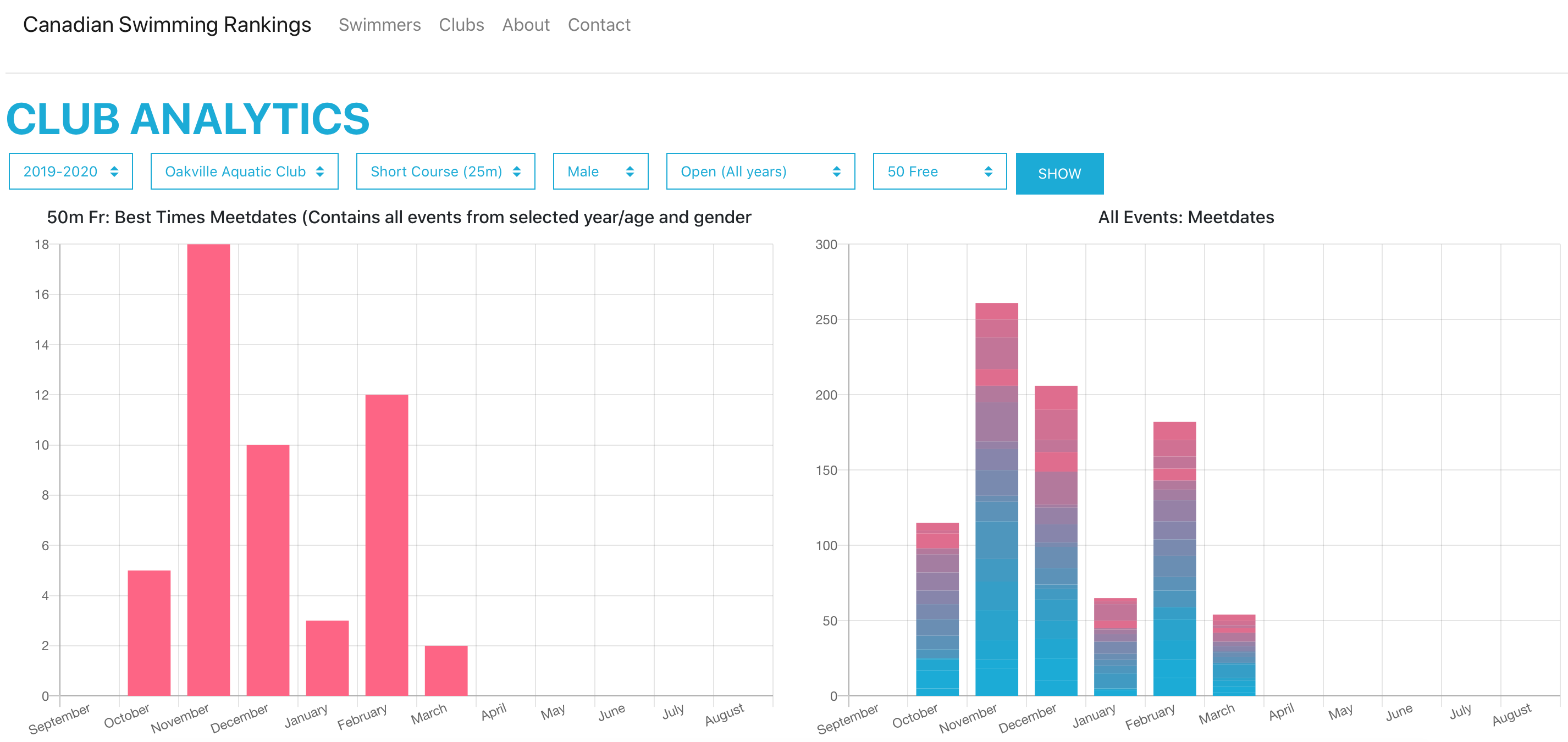 Canadian Swimming Rankings is a graphing website that allows Swimmers and Coaches to take a closer look at the trends and insights from the results across all Age groups, Events and Genders from the Current & Previous Years.